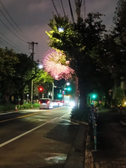 バスを待っていたら、ドーンっと鳴って、後ろを振り返れば花火があがっていたよ。