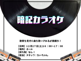 December 23 Tuesday 16:30 ~ December 23 Tuesday 18:00~ | December 24 Wednesday 16:00~ | December 25 Thursday 12:00~ | December 26 Friday 12:00~ | December 27 Saturday 17:00~ December 27 Saturday 16:00~ 【音楽イベント】暗記カラオケこんにちは!たいちゃんです! 今回の音楽イベントはこちら! ... | ||