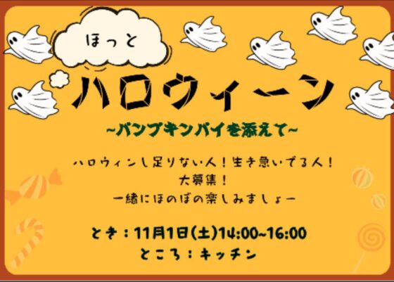 こんにちは!高校二年生のりみこです。 今年のハロウィンはパンプキンパイが作りたい、 いや!どうせならみんなでワイワイ作りたいと思って今回企画しました。ハロウィンを感じながらパンプキンパイをワイワイ作って、 焼く時間をワイワイ待って、ワイワイ食べる。 そして少しほっこりする。そんなゆるりとした企画です。 31日にハロウィンし足りなかった・できなかった人、最近勉強や部活で疲れてる人、 それ以外でも最近余裕が持てていない人、大募集です! みんなで楽しくて温かいハロウィンの思い出を パンプキンパイの匂いに乗せて作りましょう♫ 参加お待ちしてます! (文責:たいちゃん)