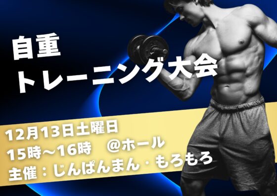 こんにちは!じんぱんまんです。 いきなりですが、今までなかった筋トレ大会イベントを開催します。 今回は、握力大会、自重トレーニング大会を開催します。 12月13日(土)の15時~16時にホールで開催します。 皆、理想の体を作りたいですか?初心者大歓迎です! (文責:諸井)
