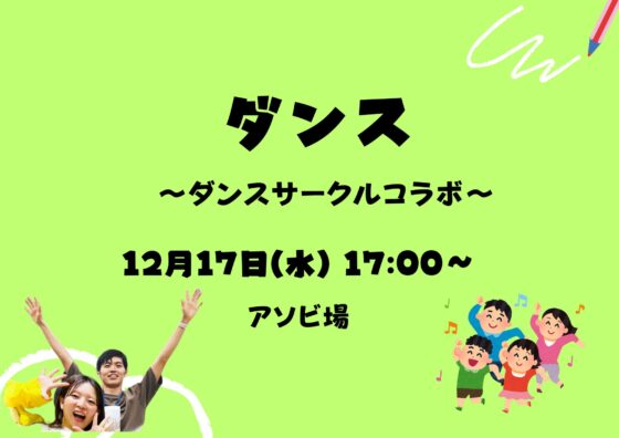December 17 Wednesday 17:00~ 【アソビ場】ダンス! b-lab #アソビ場 ツイート 12月17日(水)のアソビ場は 「ダンス」をします! TikTokでよくみるダンスを踊る予定です♪ ダンス踊ったことない人もぜひ♪ 文責しぃちゃん