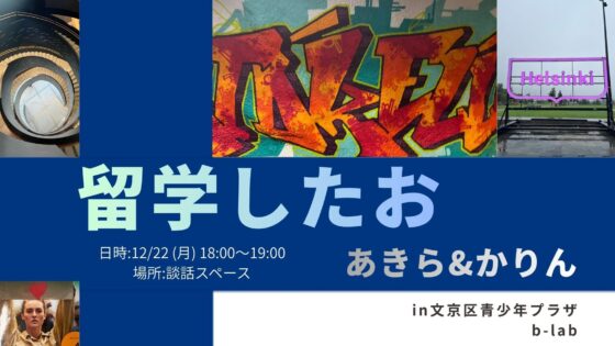 こんにちは〜 高校2年生のあきらです。 僕は今年の夏、フィンランドに留学に行ってきました。 近年、「留学」という言葉を耳にする機会が増えてきているように感じます。 同時に、「留学って実際どうなの?」と感じている人も多いはず。 そこで、実際に留学経験のある僕と、 スタッフのかりんが留学体験を語るイベントを開催します! みんなが留学についてあれこれ考える機会になればと思います。 気になる人はぜひ! 【日時】12/22 (月) 18:00〜19:00 【場所】談話スペース