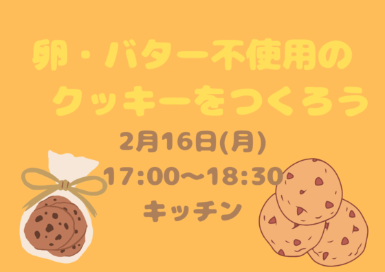 こんにちは!高校2年生のあいらです! みんなで卵・バター不使用のクッキーを作るイベントを開催します! クッキーが好きな人、お菓子作りが好きな人はぜひ参加してください! 日時▼ 2月16日(月) 17:00~18:30 場所▼ キッチン 持ち物▼ エプロン、三角巾、マスク こんな人におすすめ▼ ・クッキーが好きな人 ・お菓子作りが好きな人 ・卵などへのアレルギーがある人 (文責:かりん)