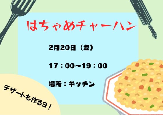 こんにちは! 高校3年生のめいめいと高校2年生のあかまです! 今回はチャーハン作るよ〜 料理が苦手な人とか、あんまりやったことない人が 「ちょっと挑戦してみようかな」って思えるイベント。 うまくできても、はちゃめちゃでもOK。 みんなで楽しく作ろう! 気軽に来てね! 待ってまーす!