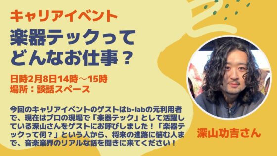 今回はb-labの元利用者で、現在はプロの現場で「楽器テック」として活躍している深山さんをゲストにお呼びしました!「楽器テックって何?」という人から、将来の進路に悩む人まで、現場のリアルな話を聞きに来てください!