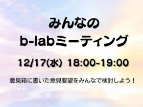 December 17 Wednesday 18:00~ みんなのb-labミーティング! こんにちは!えつおです b-labでは 「こんな設備がほしい!」 「こういう風に使えるといいな... b-lab #みんなのb-labミーティング